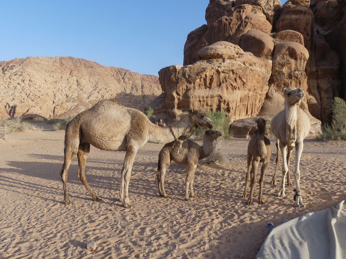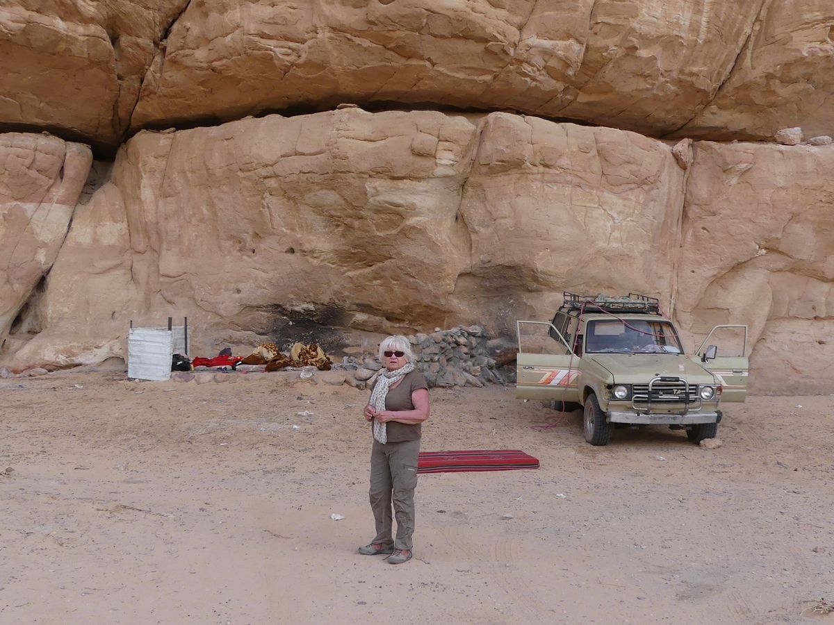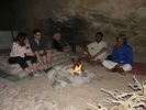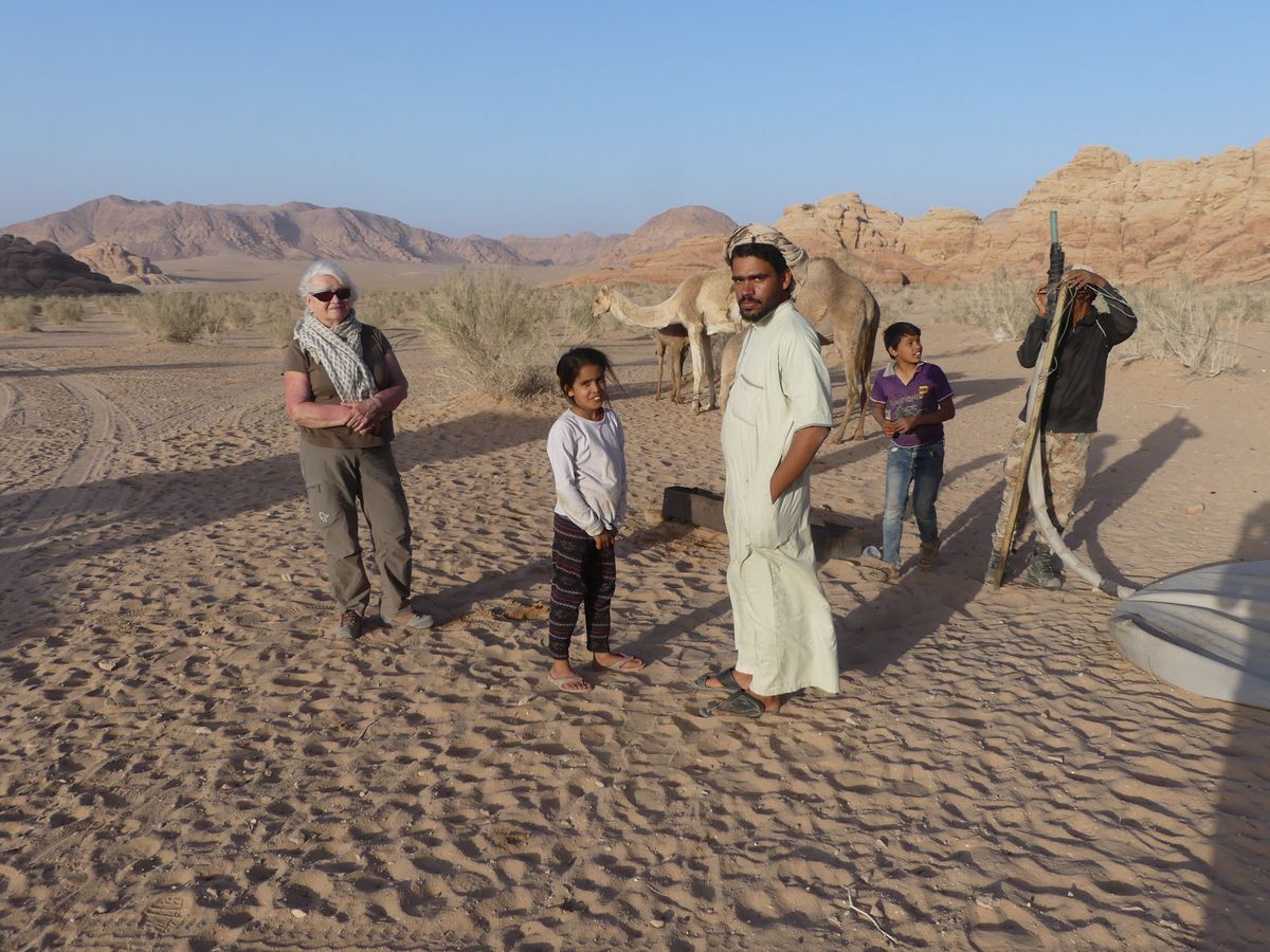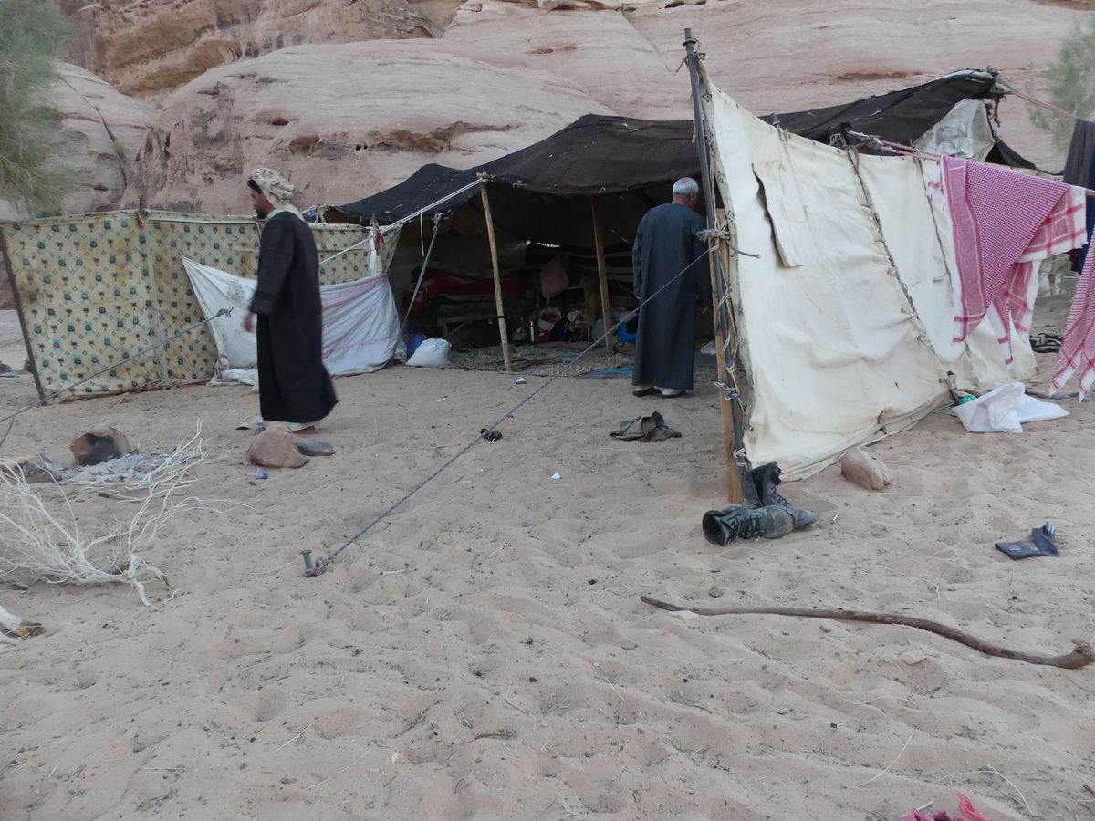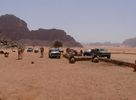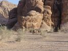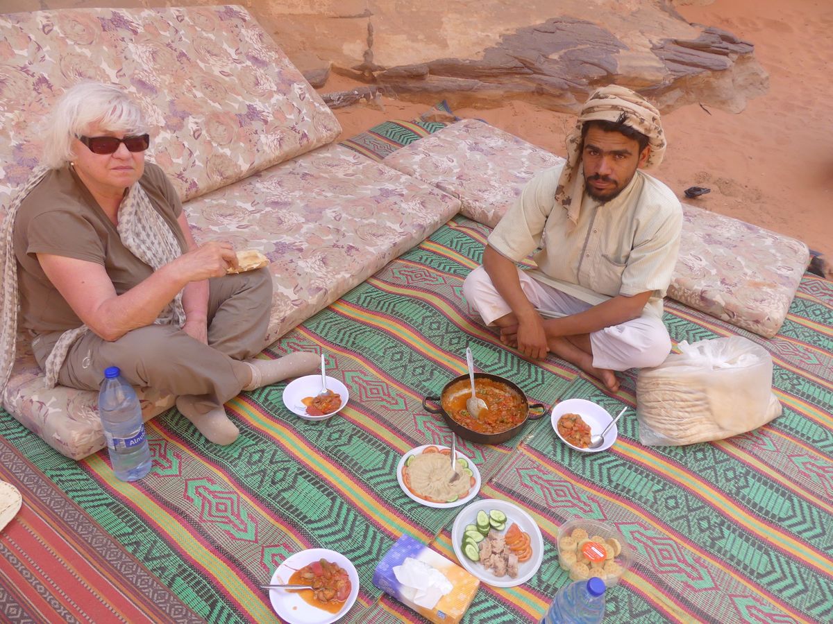 Après avoir passé deux journées à PETRA nous reprenons la route vers le sud dans le but de passer trois jours avec des bédouins qui nous feront découvrir le désert du Wadi Rum. Notre chauffeur-guide est Mohammed, il nous conduit à différents endroits pour nous montrer une source, une dune, un cañon... A chaque fois une tente de bédouin nous accueille pour nous offrir un thé, mais bien sûr nous ne sommes pas les seuls. Arrive l'heure du déjeuner : Mohammed s'arrête à l'ombre d'une falaise, déballe de son 4x4 tapis, matelas et entreprend de préparer le repas que nous apprécions. Il nous propose ensuite de faire une marche, de 2, 3 ou 4 heures. Il fait trop chaud pour nous. Alors nous choisissons de faire une bonne sieste. Nous consentons à faire une petite marche d'une demi-heure. Il a compris qu'il ne nous ferait pas marcher par cette chaleur et très honnêtement nous explique que si nous nous contentons d'une visite en 4x4 un jour suffira (alors que nous en avions réservé trois). L'affaire est conclue et nous poursuivons la visite pour atteindre en fin d'après-midi le campement de ses parents. Ils vivent sous tente (très sommaire) avec au moins quatre de leurs onze enfants, leurs chèvres, leurs moutons et leurs chamelles. Nous dînerons avec eux : ils ont tué un chevreau qui a cuit plusieurs heures sur des braises enfouies dans le sable, le couvercle de la marmite étant recouvert de sable. Nous avons beaucoup apprécié. Le repas terminé, le dernier thé bu, nous sommes partis dans la nuit pour trouver un bon endroit pour dormir : au pied d'une falaise qui nous abritait du vent. Il a redéballé tapis et matelas, fait un feu pour du thé Entre-temps deux jeunes français nous avaient rejoints avec leur guide. Nous avons bavardé autour du feu puis chacun s'est allongé sur un matelas sous une couverture épaisse. Le ciel était très lumineux et la Voie Lactée bien visible. Nous avons bien dormi. Le lendemain Mohammed nous a ramenés à notre voiture qui était restée au village.