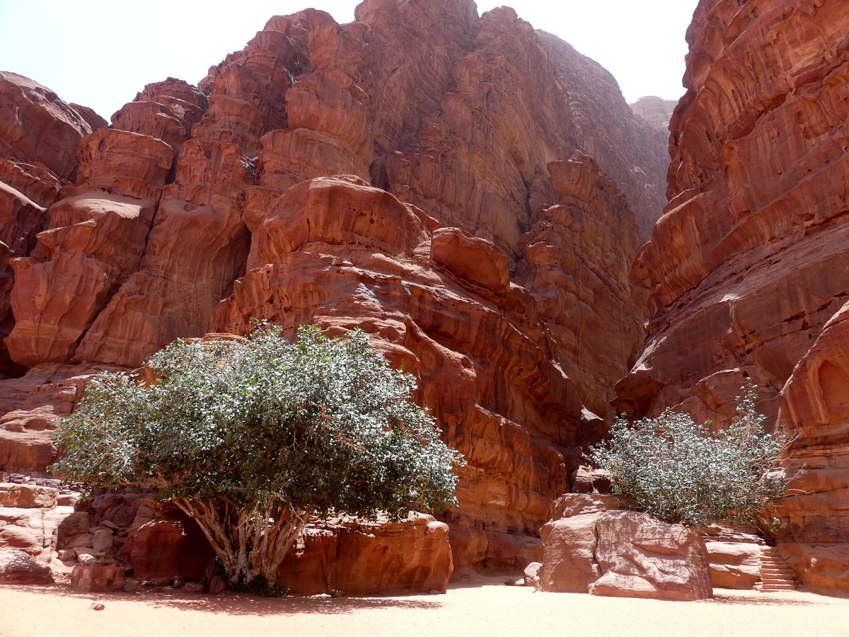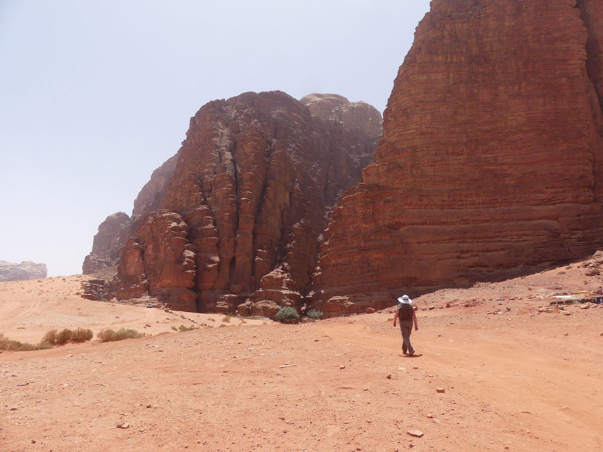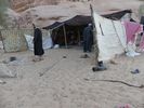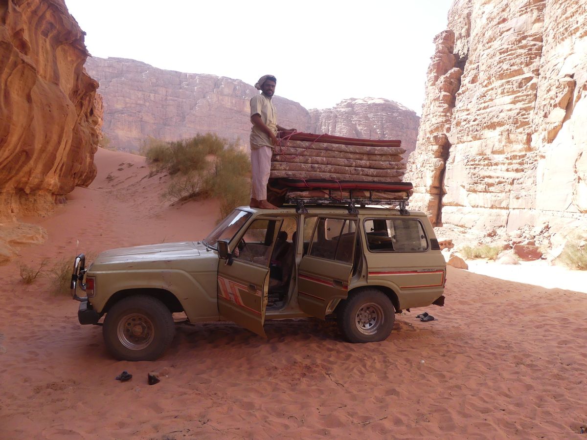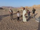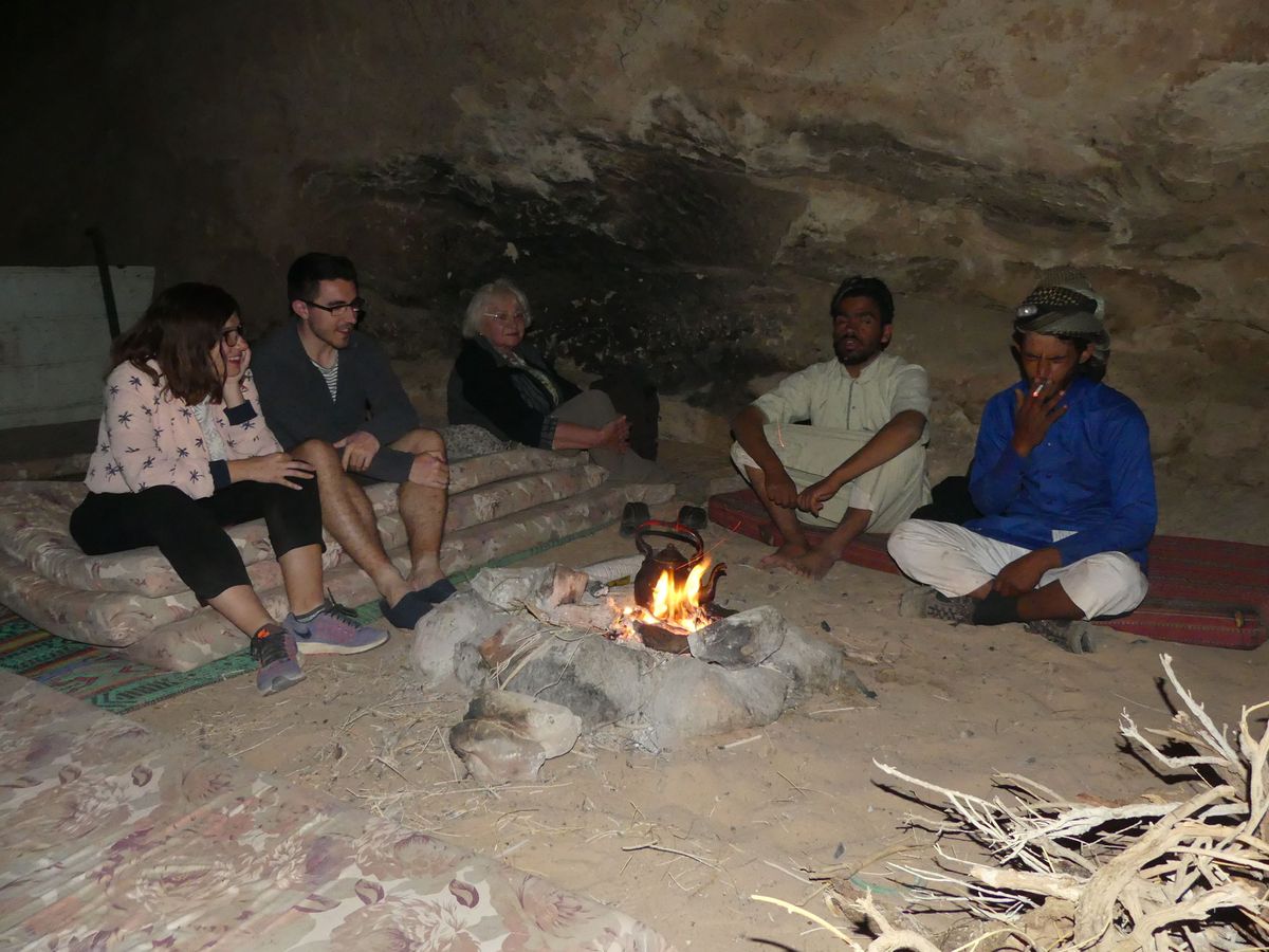 Après avoir passé deux journées à PETRA nous reprenons la route vers le sud dans le but de passer trois jours avec des bédouins qui nous feront découvrir le désert du Wadi Rum. Notre chauffeur-guide est Mohammed, il nous conduit à différents endroits pour nous montrer une source, une dune, un cañon... A chaque fois une tente de bédouin nous accueille pour nous offrir un thé, mais bien sûr nous ne sommes pas les seuls. Arrive l'heure du déjeuner : Mohammed s'arrête à l'ombre d'une falaise, déballe de son 4x4 tapis, matelas et entreprend de préparer le repas que nous apprécions. Il nous propose ensuite de faire une marche, de 2, 3 ou 4 heures. Il fait trop chaud pour nous. Alors nous choisissons de faire une bonne sieste. Nous consentons à faire une petite marche d'une demi-heure. Il a compris qu'il ne nous ferait pas marcher par cette chaleur et très honnêtement nous explique que si nous nous contentons d'une visite en 4x4 un jour suffira (alors que nous en avions réservé trois). L'affaire est conclue et nous poursuivons la visite pour atteindre en fin d'après-midi le campement de ses parents. Ils vivent sous tente (très sommaire) avec au moins quatre de leurs onze enfants, leurs chèvres, leurs moutons et leurs chamelles. Nous dînerons avec eux : ils ont tué un chevreau qui a cuit plusieurs heures sur des braises enfouies dans le sable, le couvercle de la marmite étant recouvert de sable. Nous avons beaucoup apprécié. Le repas terminé, le dernier thé bu, nous sommes partis dans la nuit pour trouver un bon endroit pour dormir : au pied d'une falaise qui nous abritait du vent. Il a redéballé tapis et matelas, fait un feu pour du thé Entre-temps deux jeunes français nous avaient rejoints avec leur guide. Nous avons bavardé autour du feu puis chacun s'est allongé sur un matelas sous une couverture épaisse. Le ciel était très lumineux et la Voie Lactée bien visible. Nous avons bien dormi. Le lendemain Mohammed nous a ramenés à notre voiture qui était restée au village.