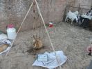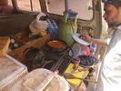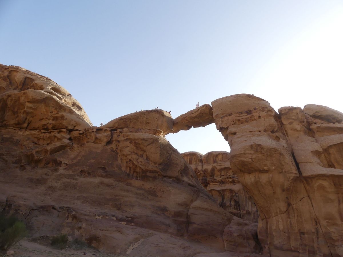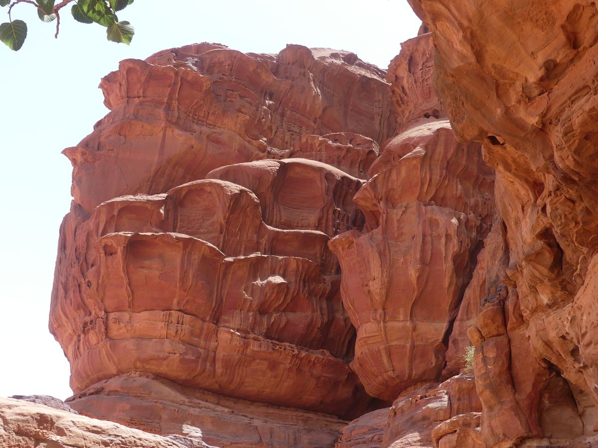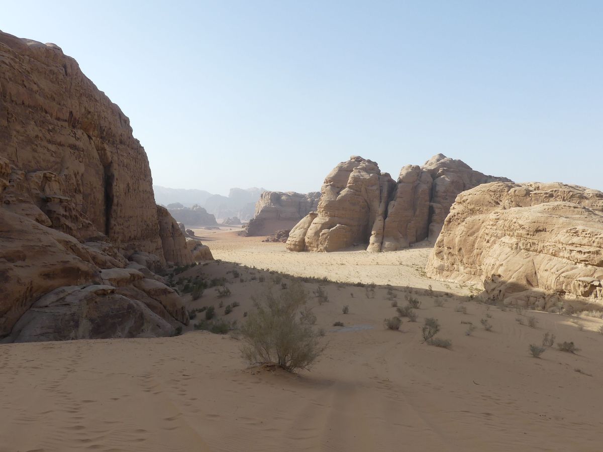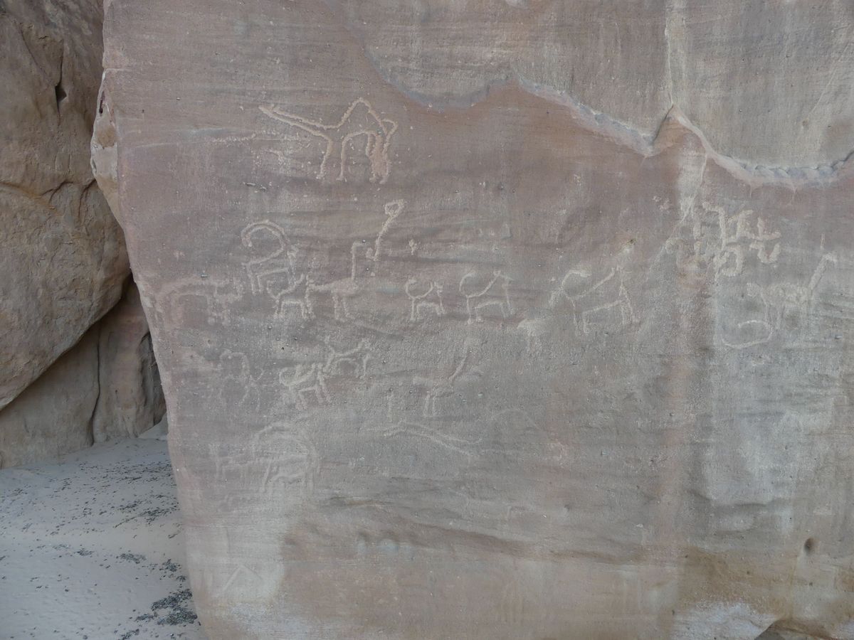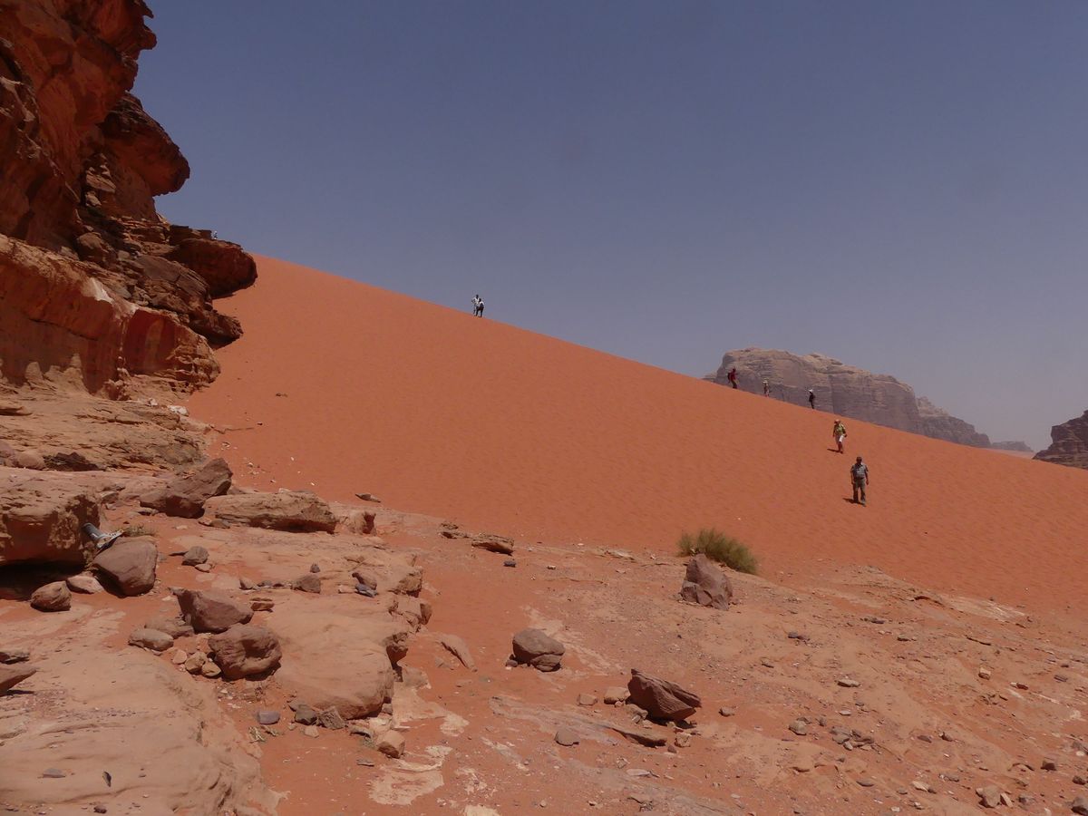 Après avoir passé deux journées à PETRA nous reprenons la route vers le sud dans le but de passer trois jours avec des bédouins qui nous feront découvrir le désert du Wadi Rum. Notre chauffeur-guide est Mohammed, il nous conduit à différents endroits pour nous montrer une source, une dune, un cañon... A chaque fois une tente de bédouin nous accueille pour nous offrir un thé, mais bien sûr nous ne sommes pas les seuls. Arrive l'heure du déjeuner : Mohammed s'arrête à l'ombre d'une falaise, déballe de son 4x4 tapis, matelas et entreprend de préparer le repas que nous apprécions. Il nous propose ensuite de faire une marche, de 2, 3 ou 4 heures. Il fait trop chaud pour nous. Alors nous choisissons de faire une bonne sieste. Nous consentons à faire une petite marche d'une demi-heure. Il a compris qu'il ne nous ferait pas marcher par cette chaleur et très honnêtement nous explique que si nous nous contentons d'une visite en 4x4 un jour suffira (alors que nous en avions réservé trois). L'affaire est conclue et nous poursuivons la visite pour atteindre en fin d'après-midi le campement de ses parents. Ils vivent sous tente (très sommaire) avec au moins quatre de leurs onze enfants, leurs chèvres, leurs moutons et leurs chamelles. Nous dînerons avec eux : ils ont tué un chevreau qui a cuit plusieurs heures sur des braises enfouies dans le sable, le couvercle de la marmite étant recouvert de sable. Nous avons beaucoup apprécié. Le repas terminé, le dernier thé bu, nous sommes partis dans la nuit pour trouver un bon endroit pour dormir : au pied d'une falaise qui nous abritait du vent. Il a redéballé tapis et matelas, fait un feu pour du thé Entre-temps deux jeunes français nous avaient rejoints avec leur guide. Nous avons bavardé autour du feu puis chacun s'est allongé sur un matelas sous une couverture épaisse. Le ciel était très lumineux et la Voie Lactée bien visible. Nous avons bien dormi. Le lendemain Mohammed nous a ramenés à notre voiture qui était restée au village.