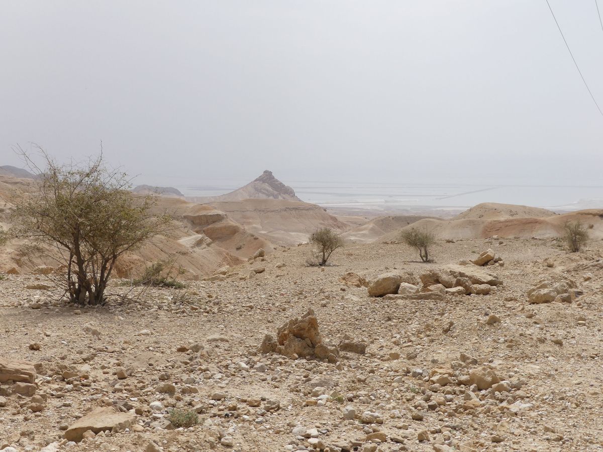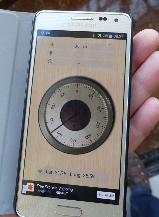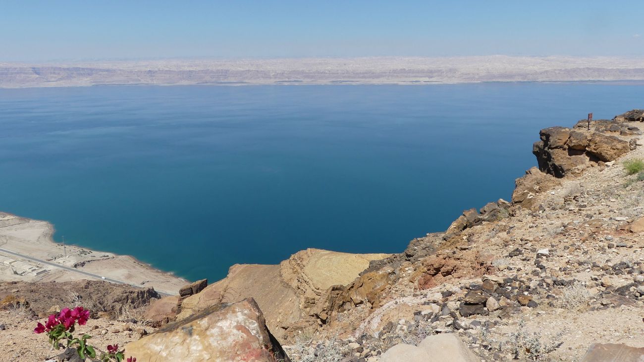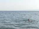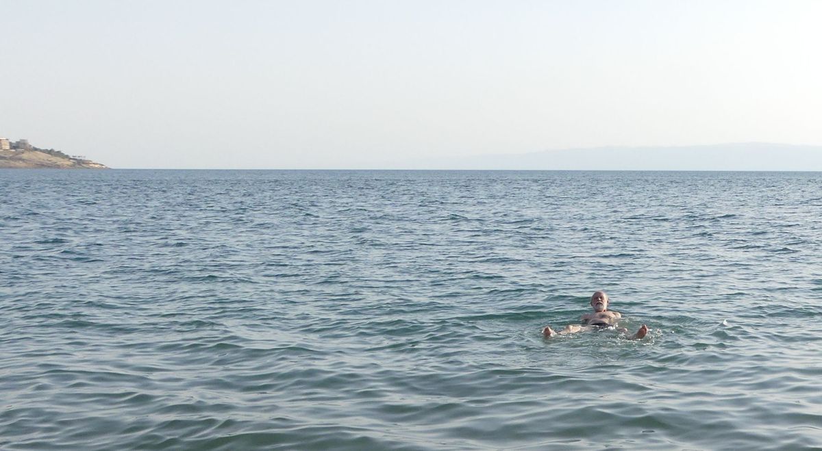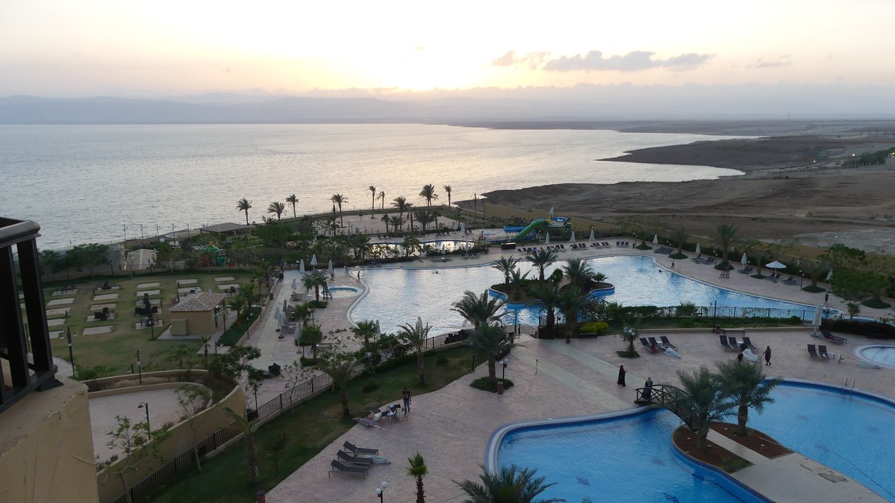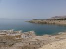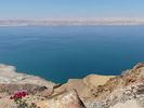 Nous longeons la Mer Morte du sud au nord : le sud est industrialisé par l'exploitation du phosphate avec de vastes bassins de décantation ou d'évaporation peu sympathiques. Il faut atteindre le nord pour trouver des accès à la mer. Nous descendons à la petite plage de notre hôtel pour un bain rapide : curieuse sensation de flotter sans pouvoir se tenir verticalement dans l'eau quand on veut reprendre pied.