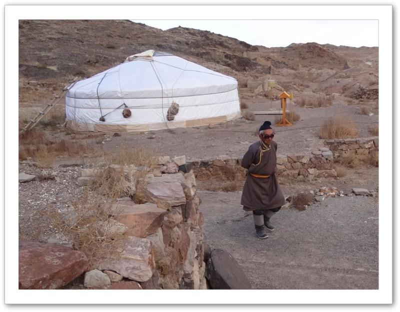 le gardien du monastère d'Ongiyn et la yourte qui abrite le musée. Notez les pierres qui lestent la yourte